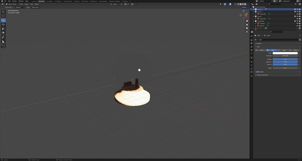 At the end of the independent study, I worked on improving the houses by adding rooves to each one. I also managed to figure out why the sphere wasn’t working as intended and that was due to the transmission not being set at 0.1