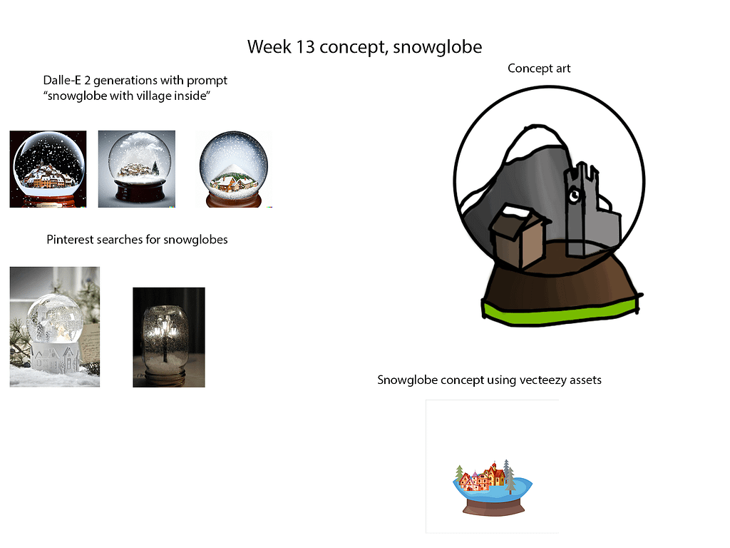 As week 13 was an assessment week I was not required to come in as I could do it from home. I decided that for this week I would stay at home and work from my home computer as I have the requirements to use the software. For the first lesson I began creating concept art. I did this by going onto Dall-e and producing ai generated photos of snow globes. I then went onto Pinterest and looked at some peoples creations of snow globes to gain inspirations. Next, I tried producing my own concept of a snow globe using photoshop. It went well but i believe that there were many things that could have been improved such as shading and the attention to detail. Finally i went onto Illustrator and used free assets from Vecteezy to produce a landscape for my snow globe. This was a massive improvement from my drawing and had the ideas that I had hoped to have drawn.