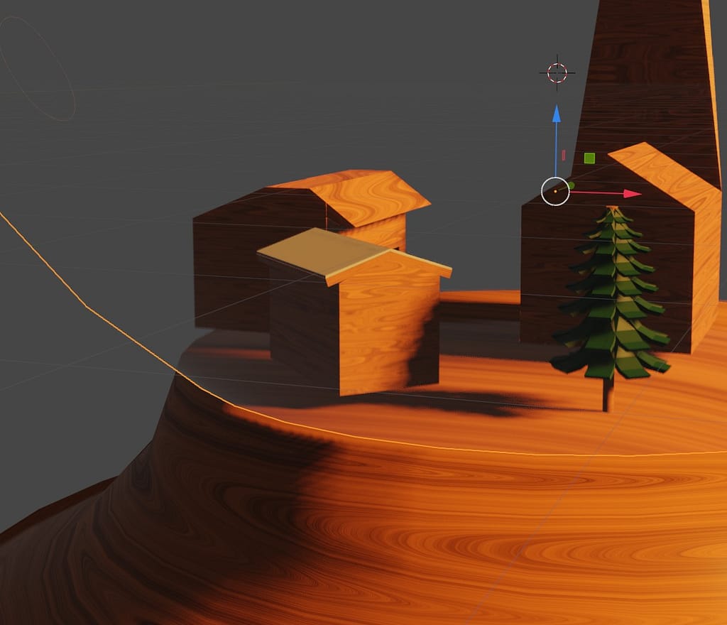 The final part of my building phase was creating the snow. I began with the small house as a way to examine how it would look. after a few adjustments, I believe that it went well and I progressed onto adding snow to the other features. I also changed the lighting to a more sunset feel as I believe it made it seem cosier and made the colours pop more