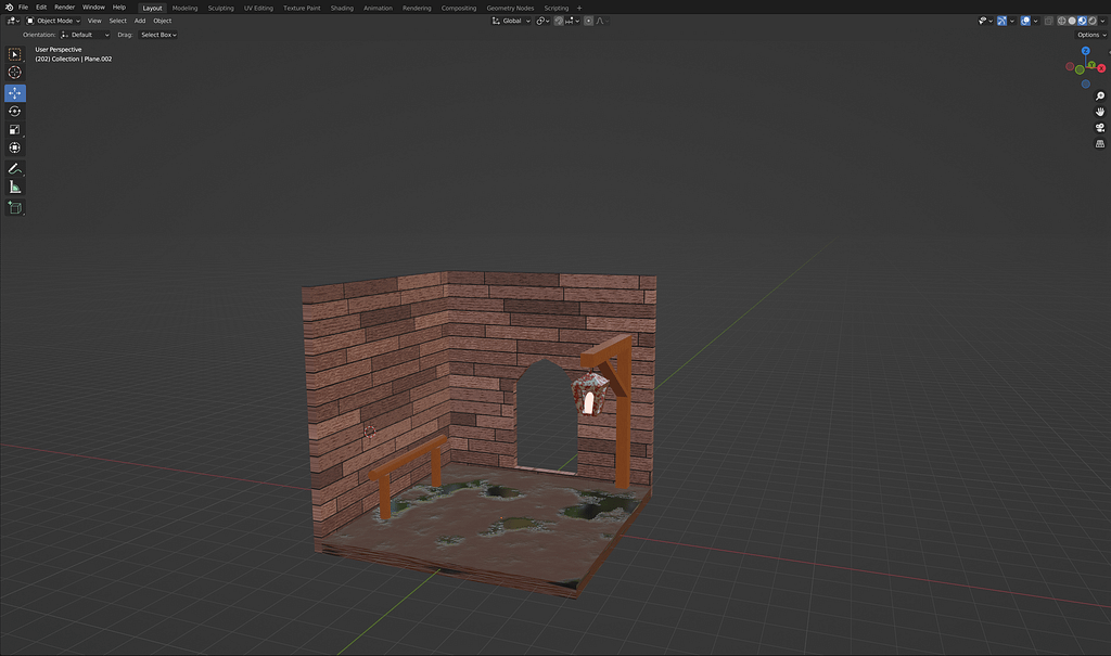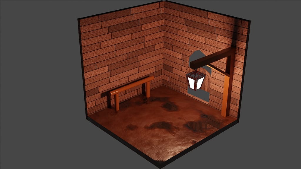 I started by changing the texture from the walls into a wooden tile style to mimic slats which at first didn’t work but after some tweaking, i eventually got it to work. I followed the tutorial below and ended up with this result. I also used a boolean modifier to create the doorway. I believe that the wooden texture makes it feel much more realistic and really makes the area feel alive.