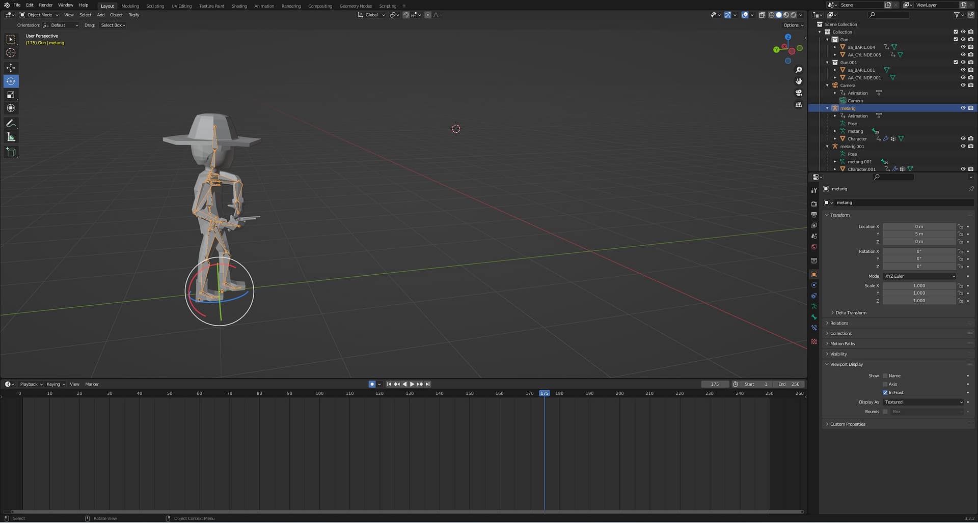Afterwards we began learning how to rig a human character. We were given a low poly cowboy model and told to create an animation within it. I decided that I would create a duel between two cowboy’s and so I used Sketchfab to find a revolver model as well as a background. unfortunately the background model didn’t transfer on one drive and so for the final render there was no setting. below is my progress as well as my final render.