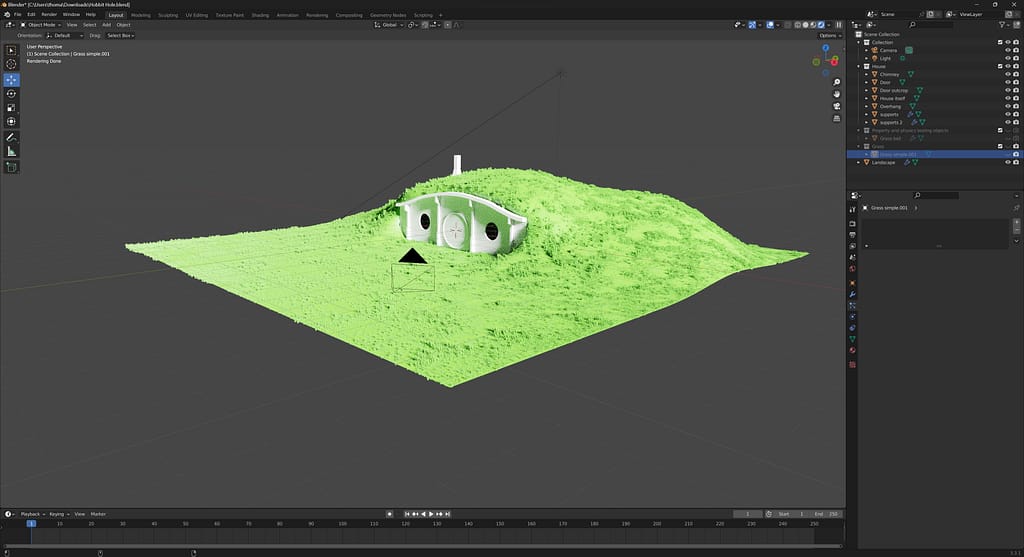 For the beginning of my lessons on Thursday, I began by creating the landscape that would serve as a basic overview of what it looks like so far. I knew that in the future I would change and alter it but I just needed to make sure that it looked natural. I used the sculpt and mirror tool to ensure a symmetrical hill and to make it feel more carved out and align with the house itself. Below is my landscape with the grass particle I created. In my opinion, I believe it went reallly well but the features such as the grass could be improved on