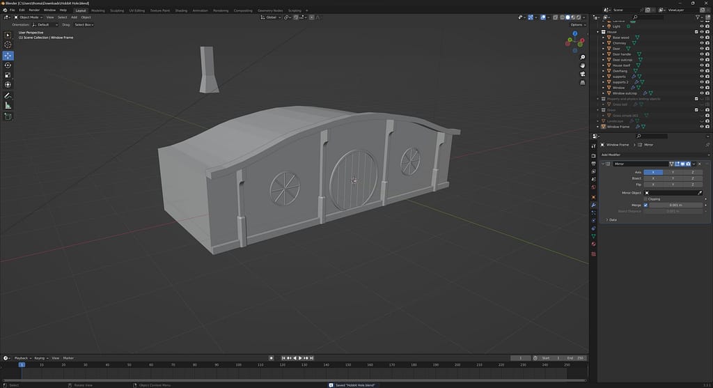 Finally, I began adding the final touches such as the window frames to the house before I’d go on to work on the landscape a bit more. I went with a traditional style that suited the hobbit hosue quite well. below is a photo of the frames before being rendered.