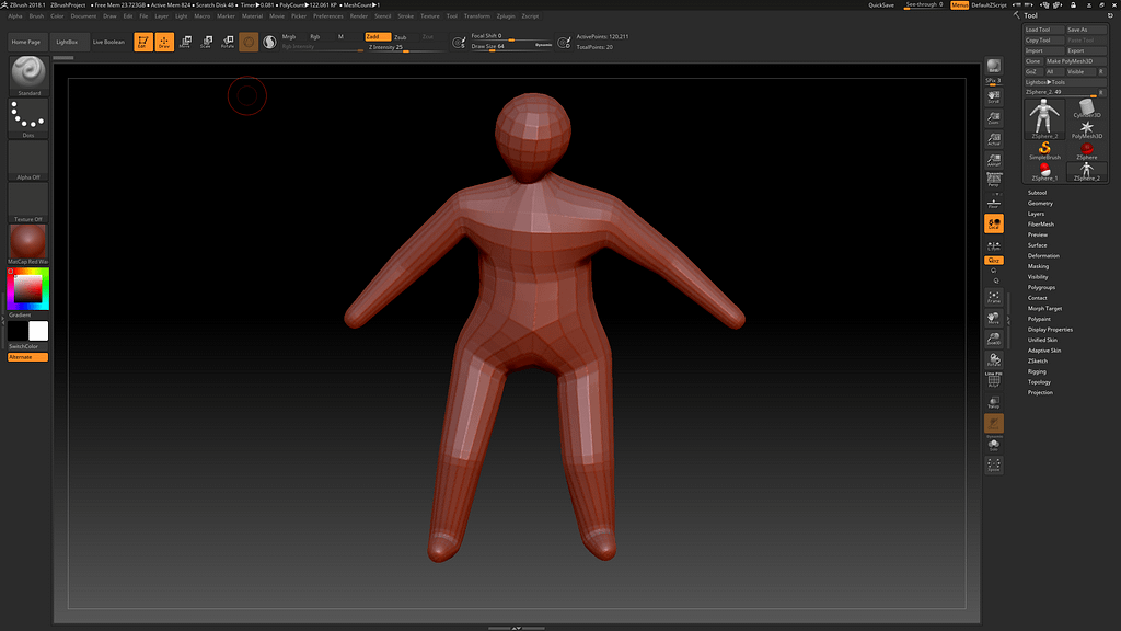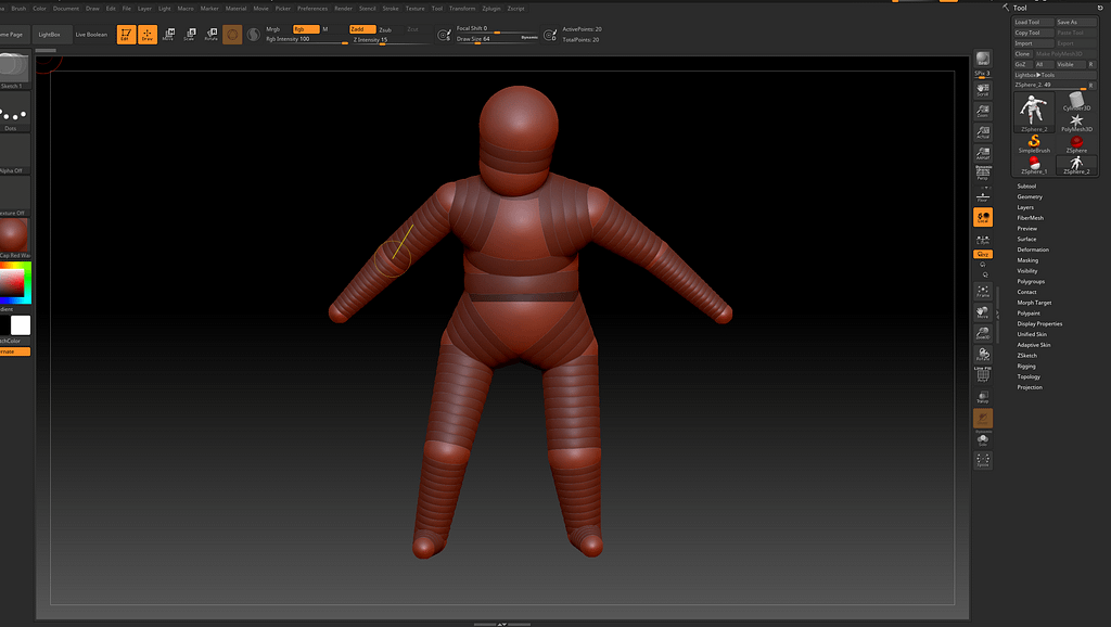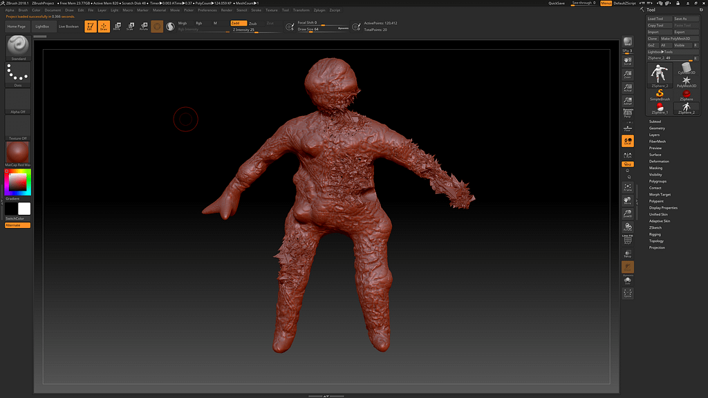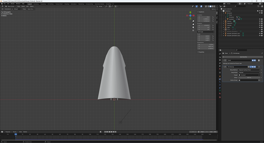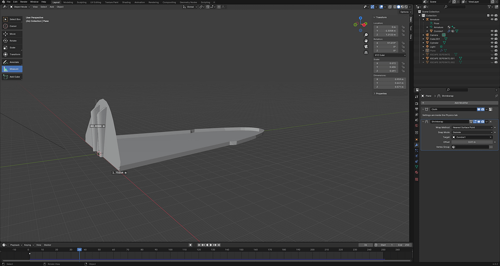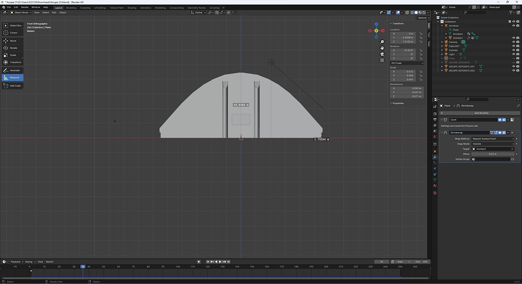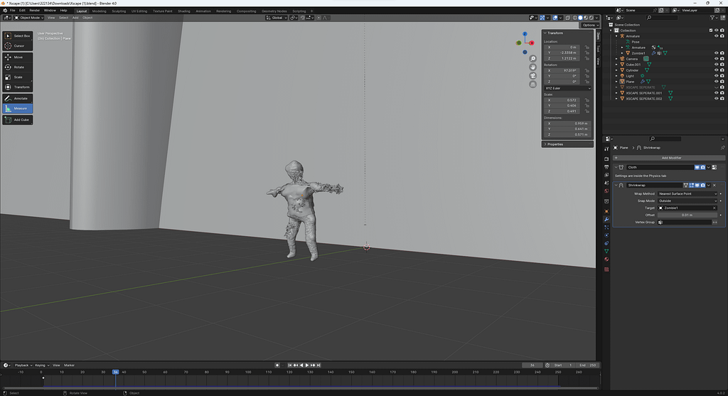 after saving the project and exporting it as a .obj file, I imported it into blender and then scaled it to the average height of a UK male; that being around 1.7m. Once imported I experimented with cloth physics to simulate ripped clothing on the zombies, however this proved challenging and would have many errors when I attempted to bake the physics, I believe this is due to the difference in poly count between the clothes and the zombie model, This is due to Zbrush creating high poly meshes whereas Blender starts with low poly meshes which can the be improved to high poly if the user requests it.